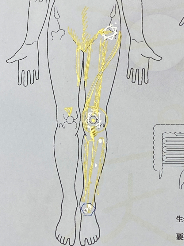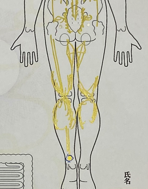 今回は歩く際に出る膝から大腿部、臀部、腰の痛みが無くなるように形霊を描き込みました。