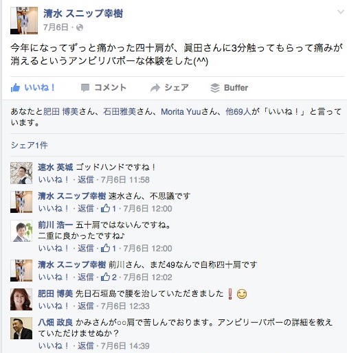 今年になってずっと痛かった四十肩が、眞田さんに3分触ってもらって痛みが消えるというアンビリバボーな体験をした(^^)