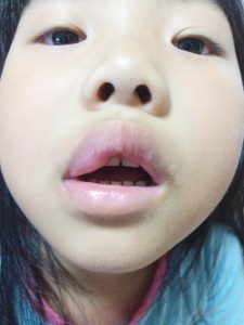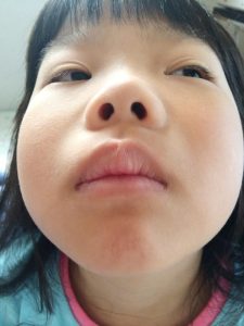 先日の事。。。夜の寝る前になって突然唇が腫れてしまった三女^^;;
