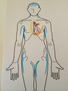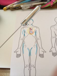 心臓を中心に ブルーのペンを使って血流を清浄にしていく感じです。心臓意外にも気になる部分があったので描き足してあります。